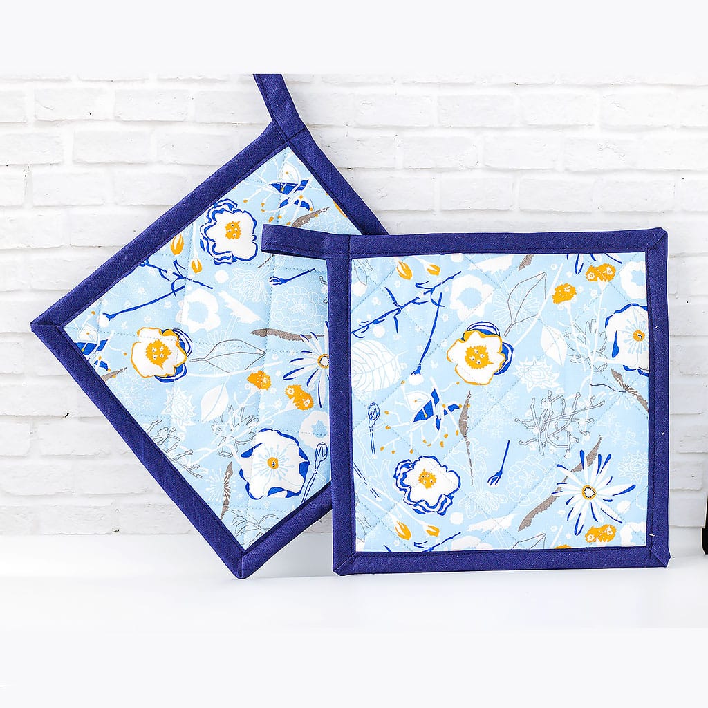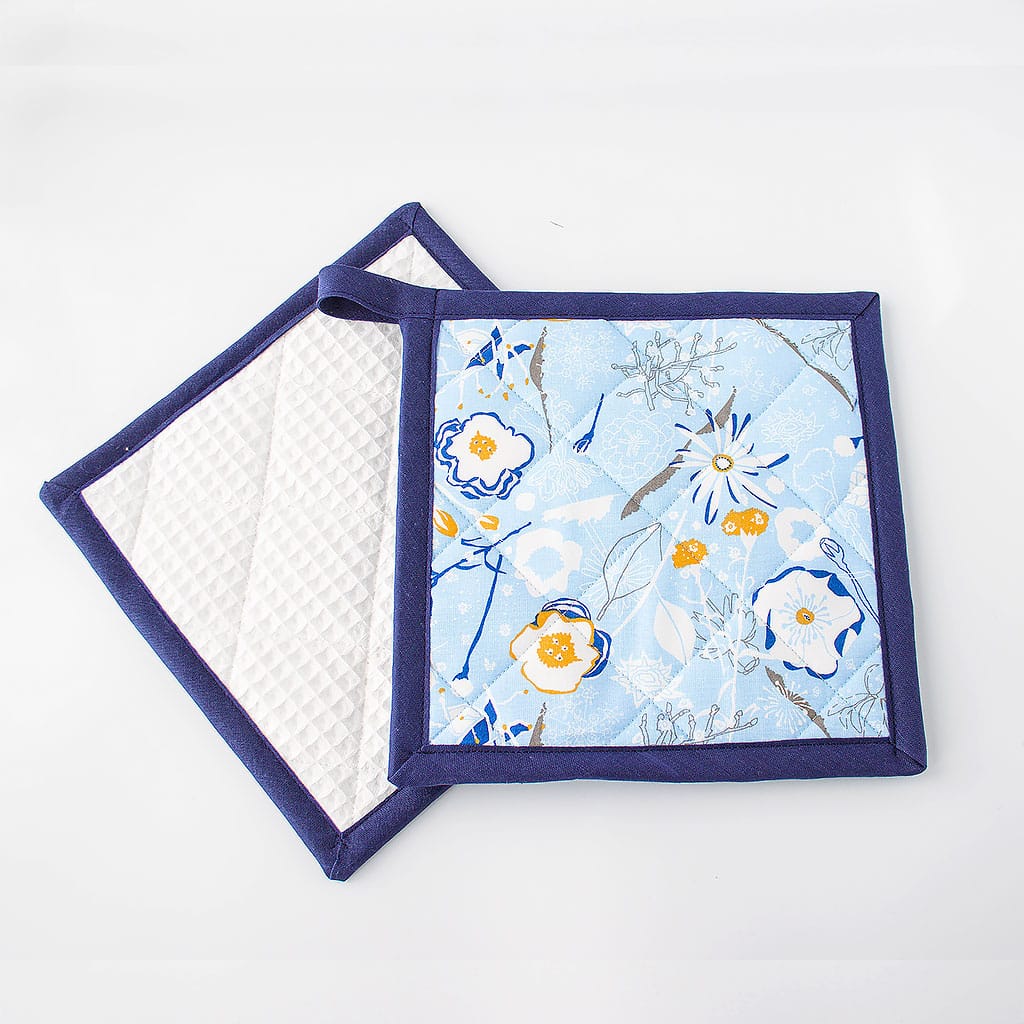 Handgefertigtes Topflappen-Set aus hochwertiger Baumwolle mit floralem Muster in Blau- und Naturtönen.